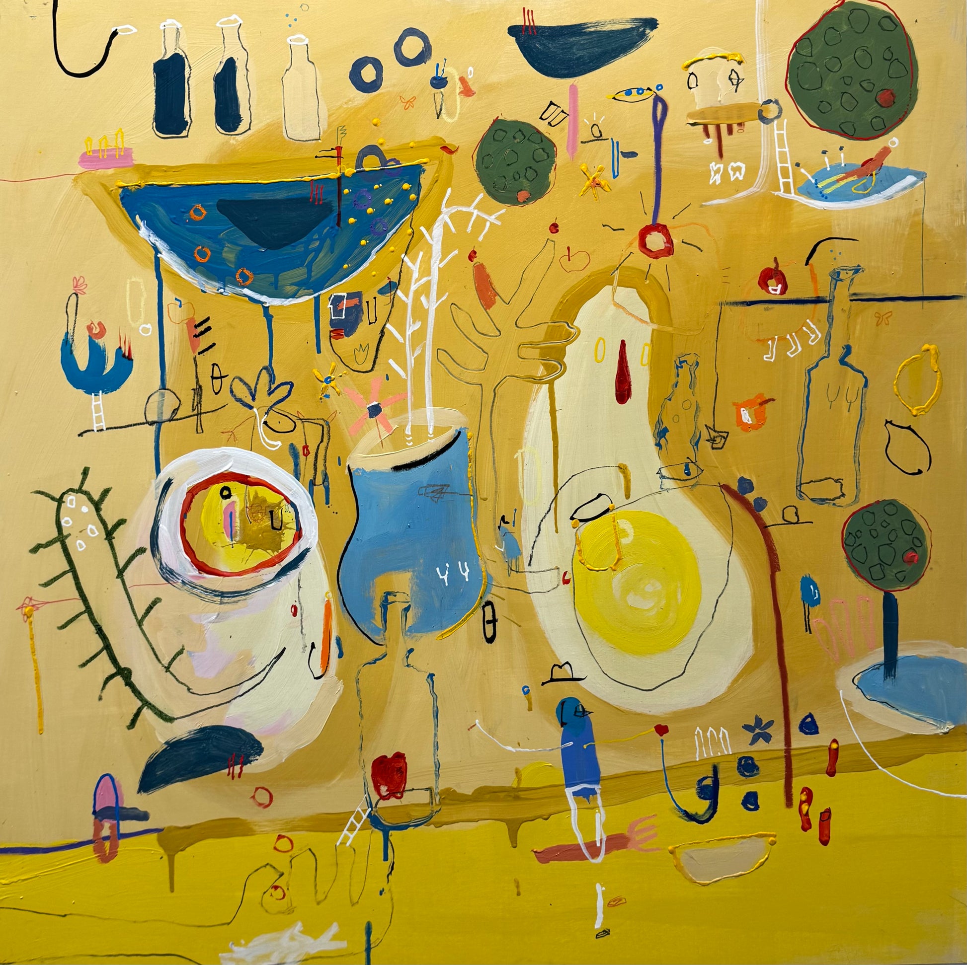 Acrylic, oil stick, sumi ink, graphite, gouache on 36 by 36 in wood panel